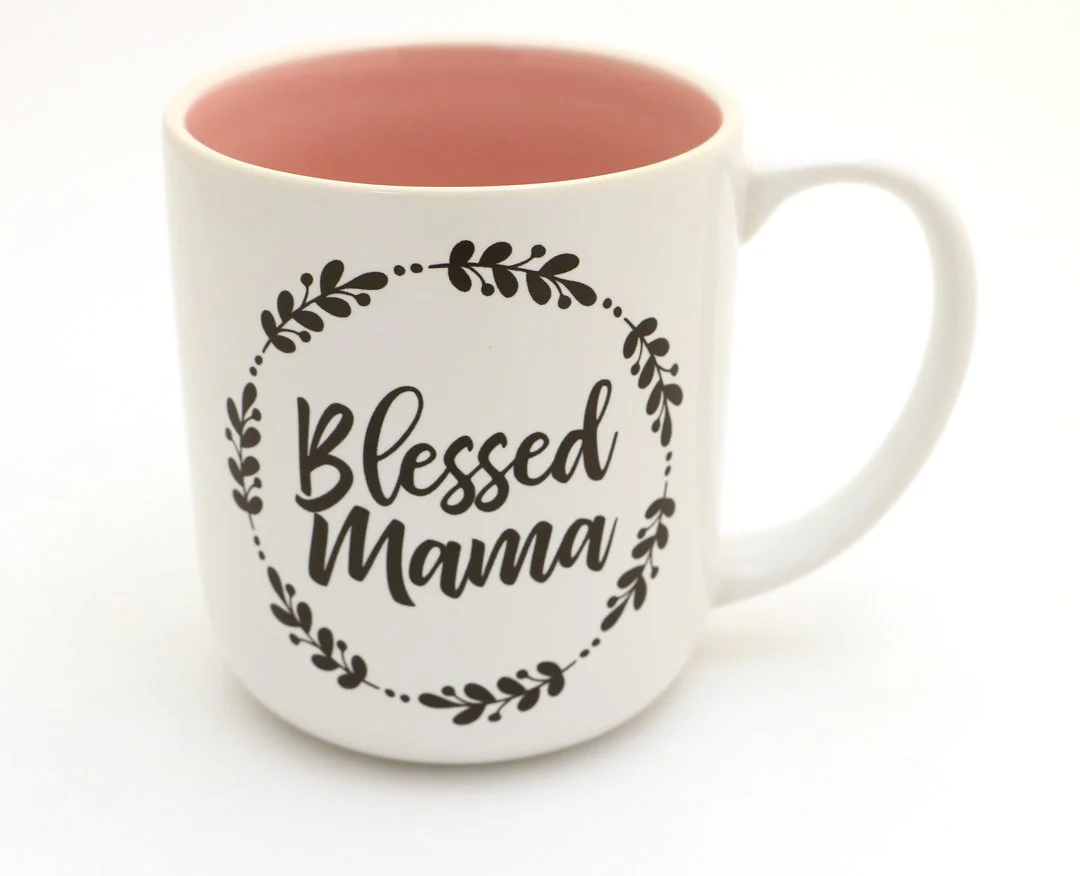 Blessed Mama mug. Back reads: Her children will Rise Up and Call her Blessed, Proverbs 31:28. Wonderful tribute to a mom of Faith and Love. Great Mother's Day gift. Interior is a soft pink. This is a handmade mug created from stoneware clay kiln fired to over 1900 degrees.