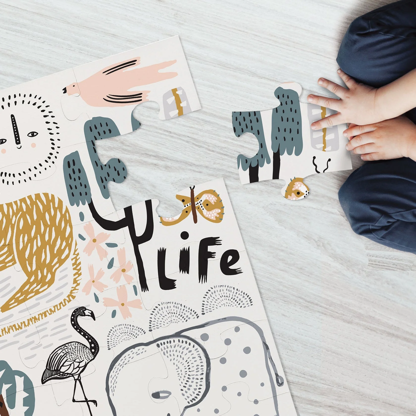 This 24 piece Wild Life Floor Puzzle celebrates the diversity of nature while encouraging learning through play! Wee Gallery's signature illustrations help support motor skill development and sensory stimulation for children 3+. The large pieces are suited to developing cognitive and motor skills in growing children, and the adorable wild animals will keep kids entertained.
